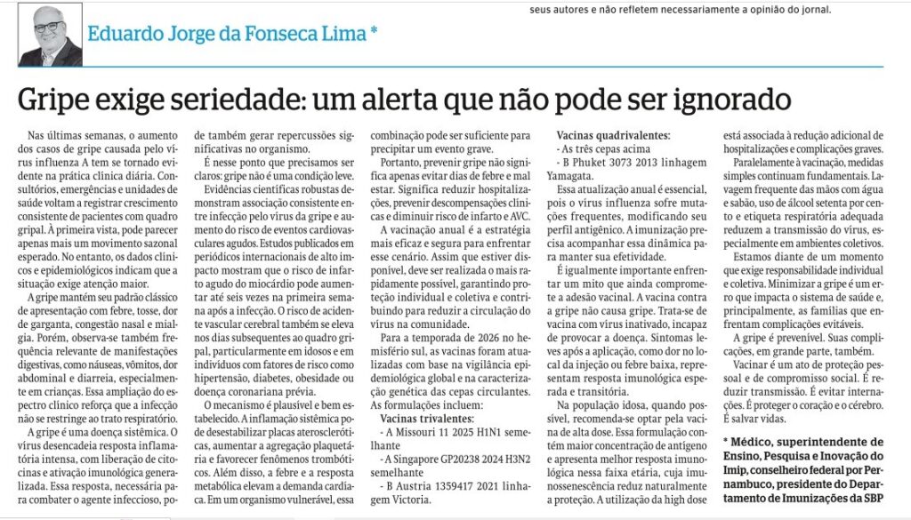 Embora o aumento de casos de gripe possa parecer um fenômeno sazonal, os dados epidemiológicos e clínicos indicam que a situação exige maior atenção. A gripe mantém seus sintomas clássicos, como febre, tosse e dor de garganta, mas o risco de complicações, especialmente entre os idosos e pessoas com comorbidades, não deve ser ignorado. “Apesar de conhecermos os sintomas da gripe, é fundamental entender que o risco de complicações graves, como infarto e AVC, está mais elevado nesse momento, o que torna a prevenção, principalmente por meio da vacinação, ainda mais importante”, afirma o Dr. Eduardo Jorge da Fonseca Lima, pediatra e superintendente de Ensino, Pesquisa e Inovação do IMIP.