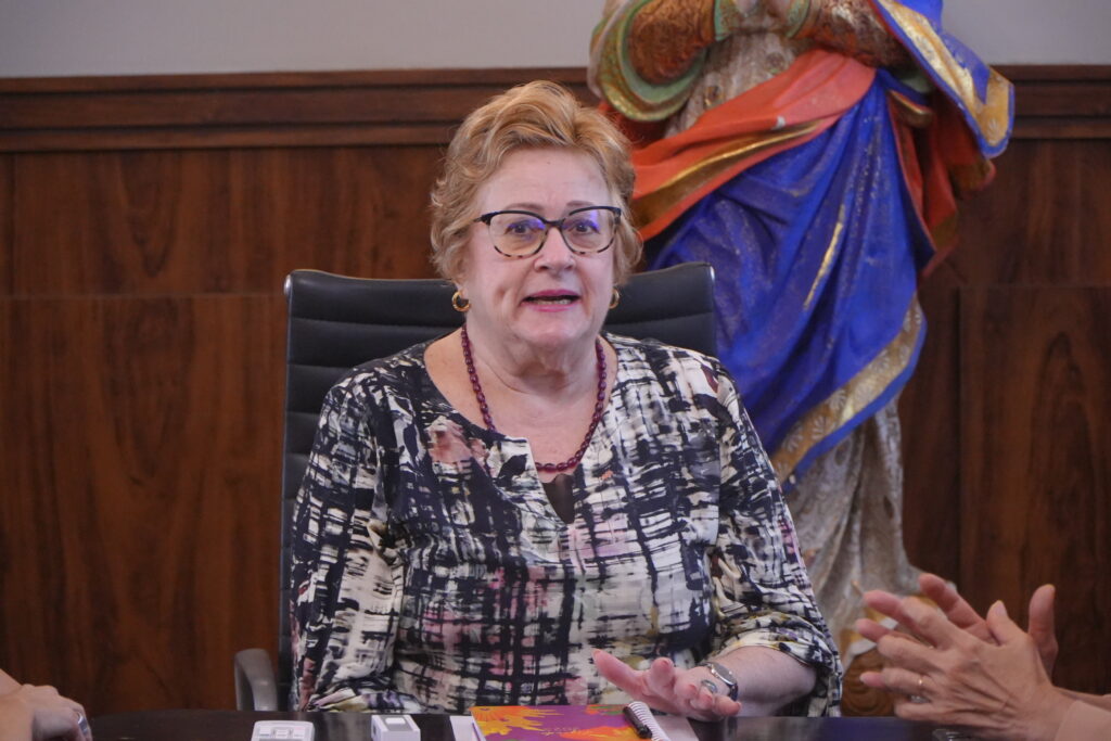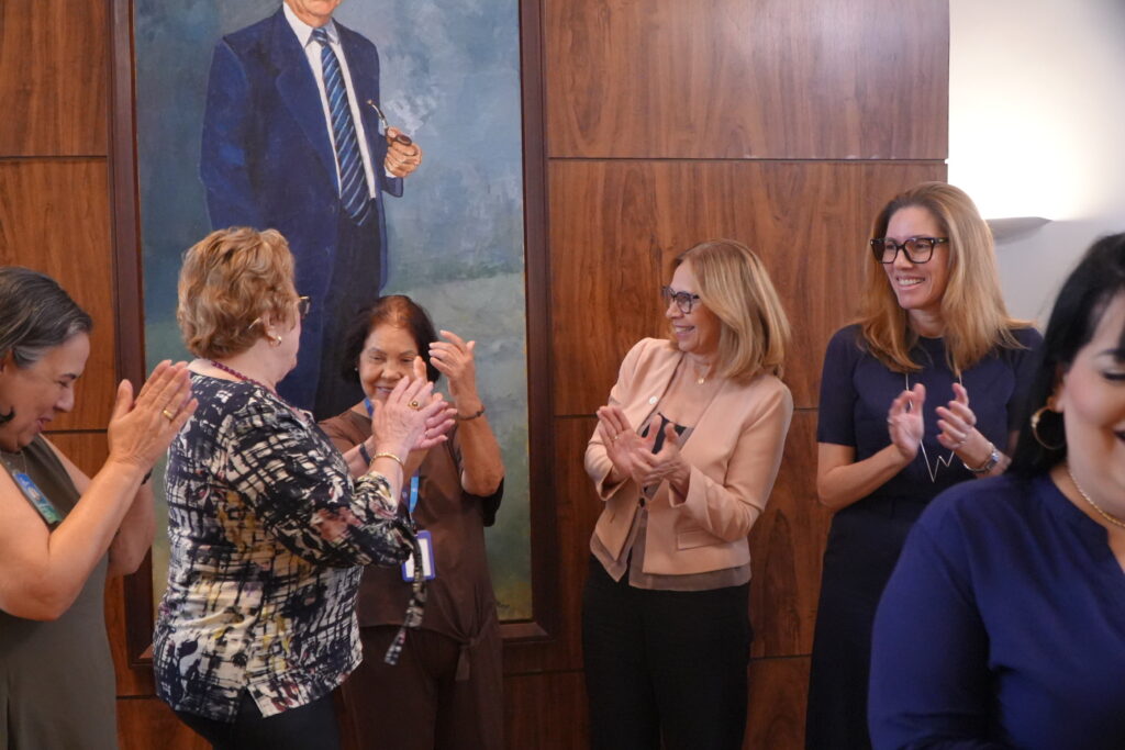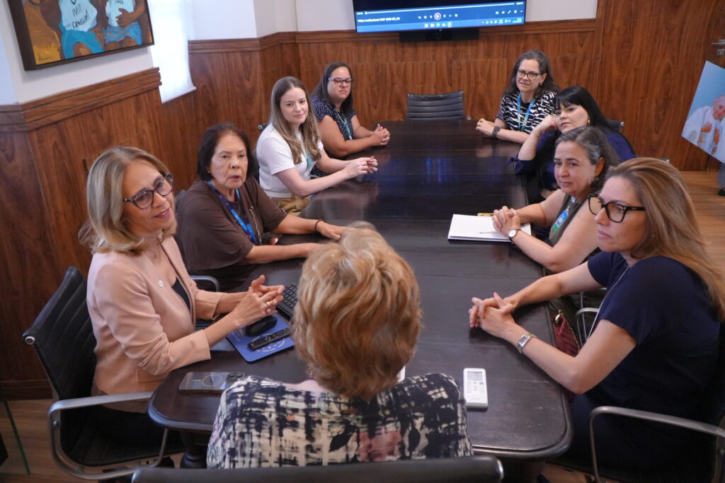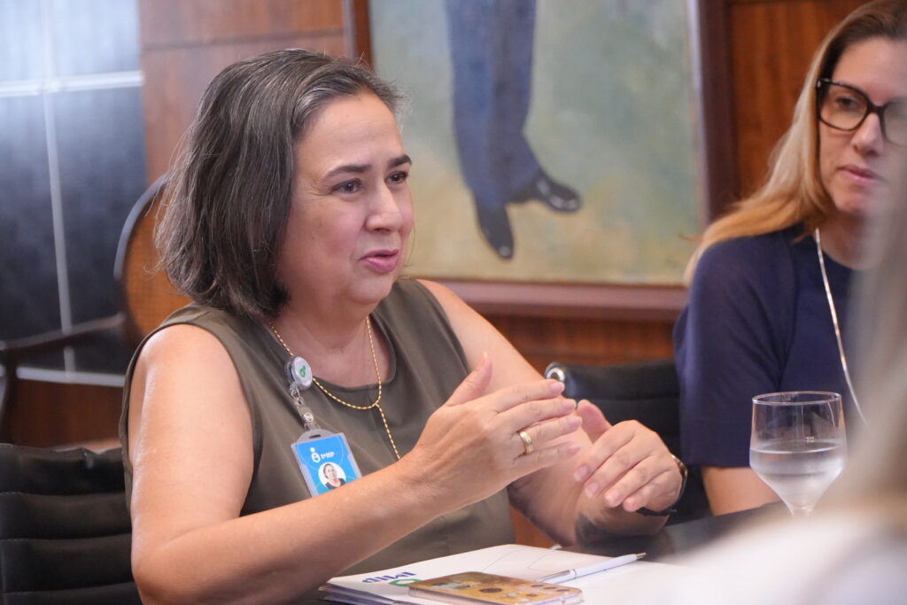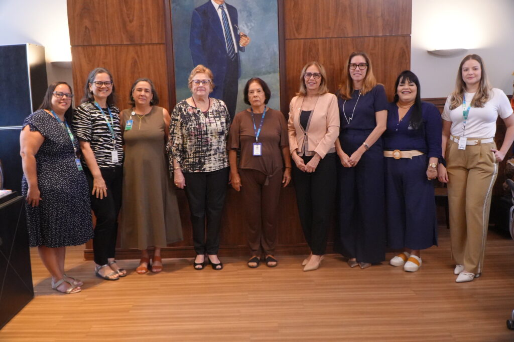 As gestoras foram recebidas na sala da presidência por Silvia Rissin, presidente do IMIP, ao lado de Tereza Campos, superintendente-geral, e Afra Suassuna, diretora de Extensão Comunitária.